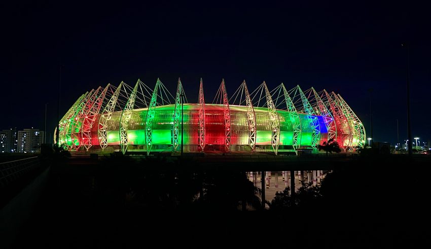 A Arena Castelão se une ao estádio do Atlético-MG, a Arena MRV, em Belo Horizonte, que foi iluminada com as cores do Rio Grande do Sul no último sábado (4).