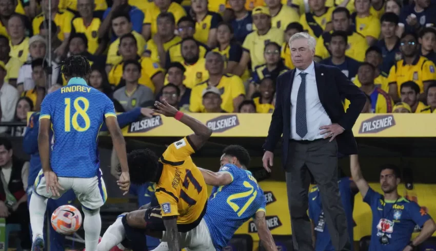 Os primeiros minutos da seleção brasileira sob o comando de Ancelotti não foram animadores. Com um Brasil guardando posição na defesa, o Equador assumiu o comando das ações. A equipe da casa trocava passes buscando espaços para entrar em uma defesa brasileira que não fazia muita pressão.