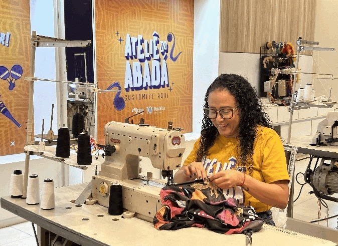 Costureiras de comunidades personalizam abadás para o Fortal em lojas sociais nos shoppings RioMar