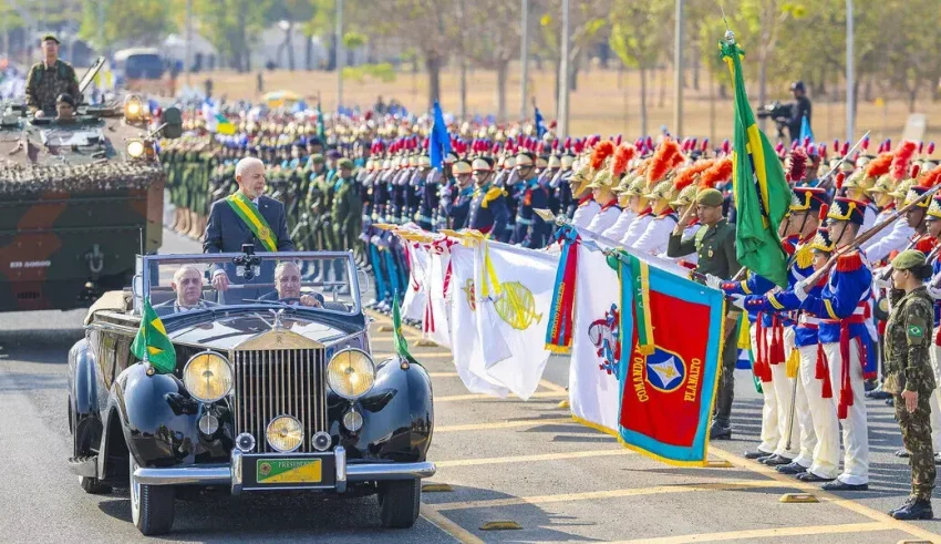 O presidente Luiz Inácio Lula da Silva abriu o desfile cívico-militar, às 9h14. O tema deste ano é Democracia e Independência. É o Brasil no Rumo Certo. Diversas autoridades estiveram presentes.