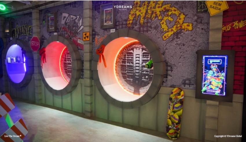 Instalada em um espaço de cerca de 1.000 m², a experiência convida o público a atravessar túneis do metrô e descobrir o QG das Tartarugas Ninja, recriado com cenografia envolvente que remete às ruas de Manhattan. Ao longo de seis áreas, o visitante percorre ambientes altamente instagramáveis, passa pela sala de estar do grupo, interage com jogos de arcade, quadra de basquete e a clássica mesa de comando, além de conhecer de perto o universo de cada personagem, seus objetos favoritos e curiosidades.