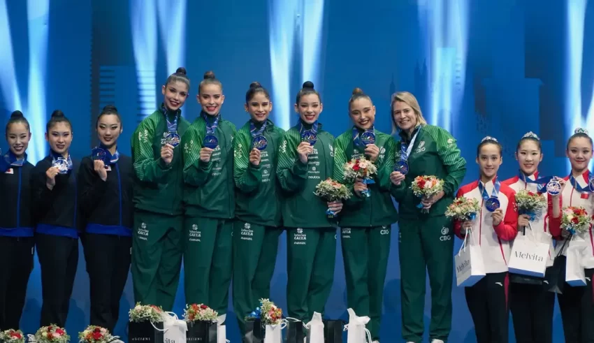 A ginástica rítmica brasileira conquistou pela primeira vez na história uma medalha de ouro no conjunto geral em uma etapa da Copa do Mundo da modalidade. A façanha ocorreu neste sábado (19), na etapa de Milão (Itália), quando as brasileiras subiram ao topo do pódio, com nota final 52.850, acima das obtidas pela equipe japonesa (50.500) e chinesa (50.200), que ficaram com prata e bronze, respectivamente.