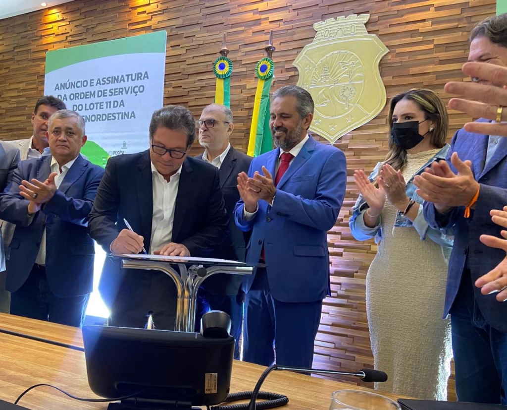 Com 1.206 km de extensão em sua linha principal, atravessando 53 municípios, desde o Piauí ao Ceará, o projeto da Transnordestina avançou ainda mais na manhã desta segunda-feira (27), com a autorização de mais um trecho de construção da ferrovia. Ao lado de várias autoridades, o governador Elmano de Freitas assinou a ordem de serviço do lote 11, que corresponde à extensão de 26 quilômetros, do Porto do Pecém a Caucaia. A previsão é que sejam criados 700 empregos diretos apenas durante a construção deste trecho.