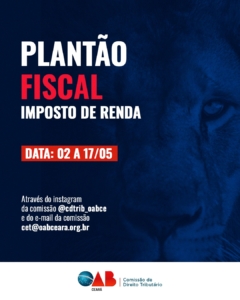 A Comissão de Direito Tributário da Ordem dos Advogados do Brasil – Secção Ceará (OAB-CE) dá orientações e tira dúvidas sobre a declaração do Imposto de Renda Pessoa Física 2025 até o próximo dia 17 de maio. O Plantão Fiscal está disponível pelo e-mail cet@oabceara.org.br e pelo Instagram da Comissão (@cdtrib_oabce).