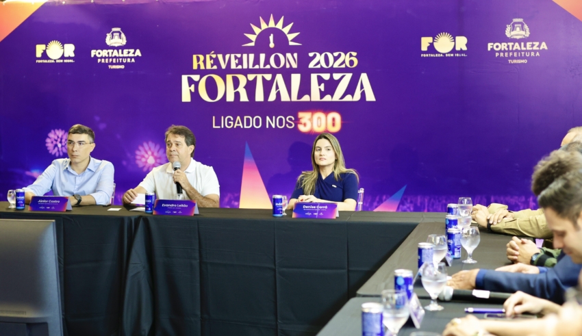 A Prefeitura de Fortaleza anunciou, em coletiva realizada na manhã desta terça-feira (23), o plano operacional do Réveillon 2026. O momento contou com a presença do prefeito Evandro Leitão e de representantes de órgãos municipais envolvidos na organização do evento. A apresentação foi conduzida pela secretária do Turismo, Denise Carrá, que detalhou o planejamento integrado das ações e o modelo descentralizado do evento, que neste ano contará com polos em Messejana, no Conjunto Ceará e no Aterro da Praia de Iracema.